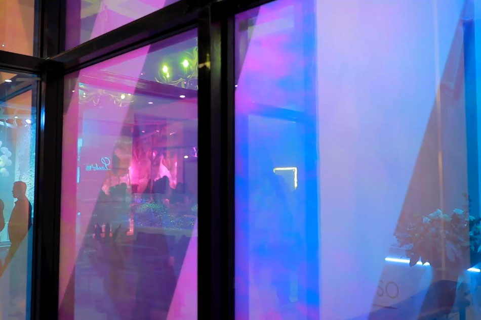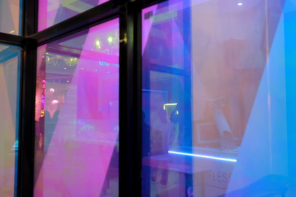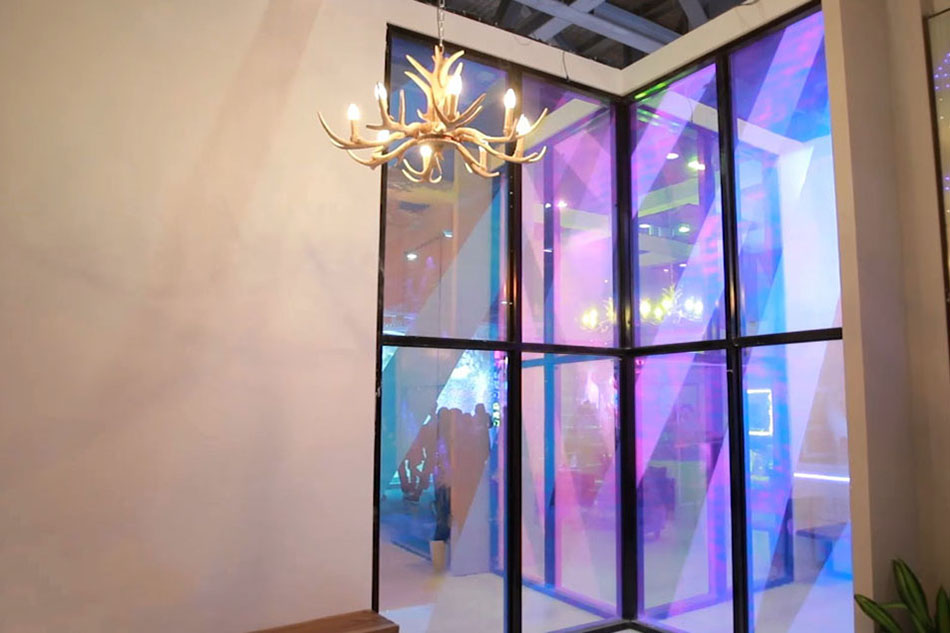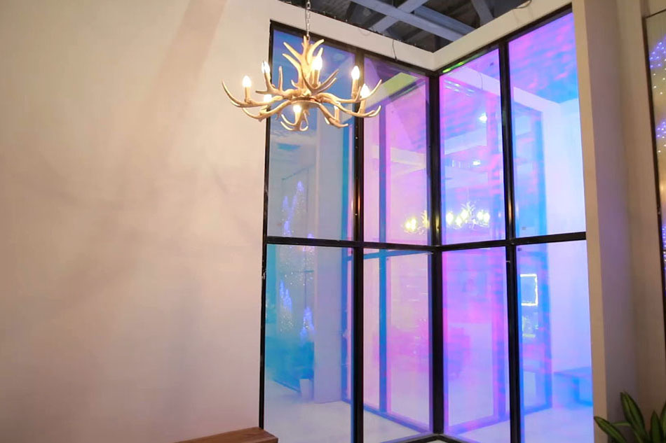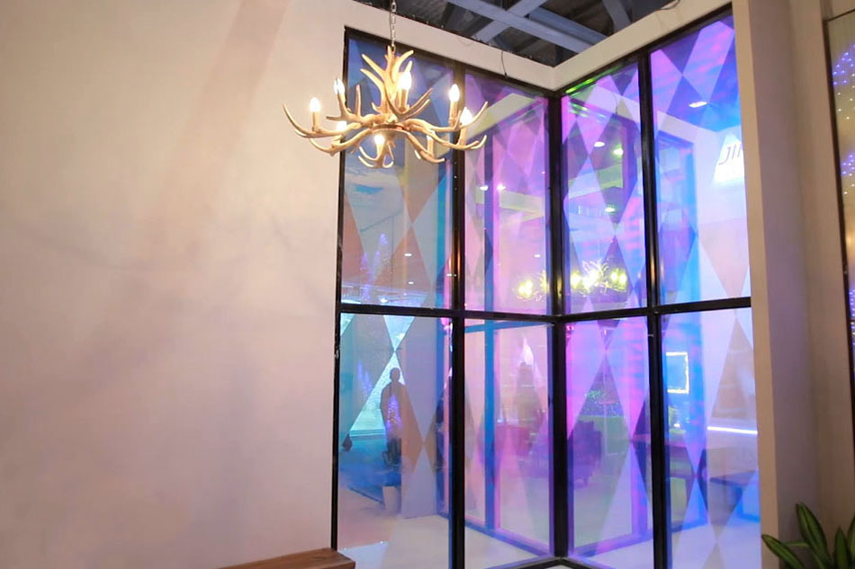 玻璃里面不止有液晶膜,還有帶水波紋或云霧效果的彩膜,在不同的角度觀看會呈現(xiàn)不同的效果。