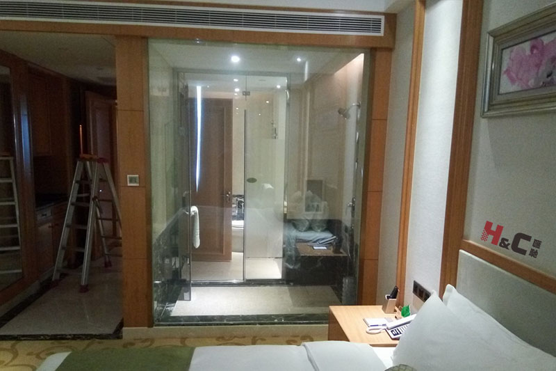 一些高星級的酒店里都會有浴缸這種豪華配置,配合調(diào)光玻璃隔斷,美觀實用,更能增加情趣。浴缸的長度一般在1.7米以內(nèi),如果要用調(diào)光玻璃作為浴室隔斷,一片寬幅1800mm的調(diào)光玻璃就可以完全遮擋住浴缸。