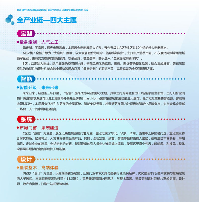 為更好符合市場(chǎng)趨勢(shì),促進(jìn)家居行業(yè)的融合,廣州建博會(huì)將首推“大定制”題材,與家居建材行業(yè)領(lǐng)軍企業(yè)攜手,引領(lǐng)行業(yè)發(fā)展新風(fēng)尚。