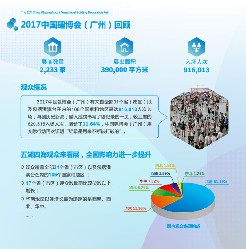 一年一度的中國(guó)(廣州)國(guó)際建筑裝飾博覽會(huì)將于2018年7月8號(hào)到11號(hào)在廣州琶洲國(guó)際會(huì)展中心舉辦。此次展會(huì)的主題是:為大家居建裝行業(yè)提供整體解決方案。