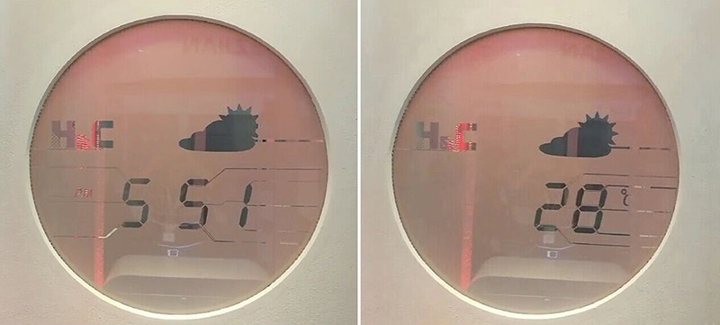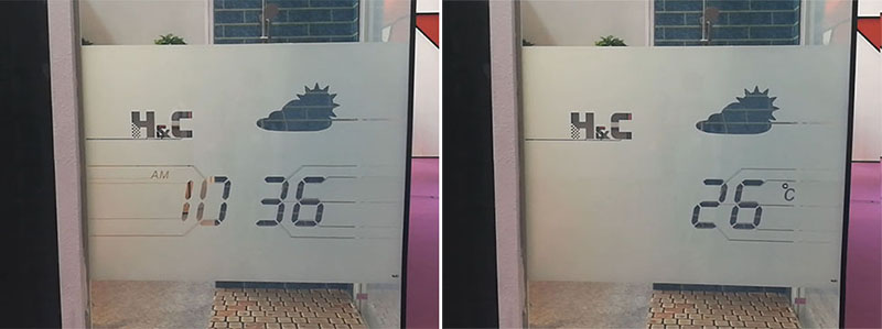 玻璃顯示的信息內(nèi)容是不能更改的,比如視頻中的玻璃就只能顯示時間、天氣和溫度。它不同于LED顯示屏可以顯示任意信息,而是要預(yù)先設(shè)計好。比如公司的Logo、星期、月份、濕度等信息,都是可以在最初設(shè)計時加上去的。