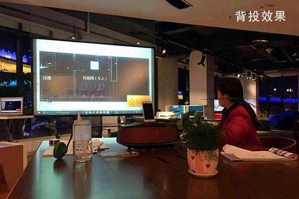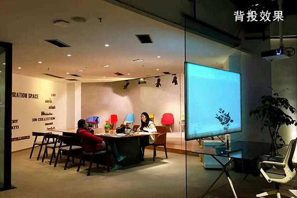 調(diào)光玻璃(霧化玻璃)在不透明時(shí),可以當(dāng)作投影硬屏使用。在光線適宜的環(huán)境下,利用高清投影機(jī)將圖像背投到調(diào)光玻璃上,成像效果出眾。結(jié)合觸控設(shè)備即可組建成大型“平板電腦”。通過手指點(diǎn)觸操作,滿足會(huì)議投影及櫥窗對外投放廣告的需要。